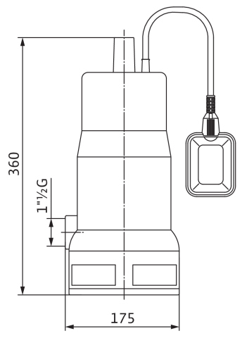 Sewage pump with vortex impeller and vertical threaded connection. Pump housing and impeller made of composite material. 1~ motor with integrated operating capacitor, self-switching thermal motor monitoring, and basic sealing with a rotary shaft seal. Motor housing made of steel. Connection cable with float switch and fitted plug (CEE 7/7).