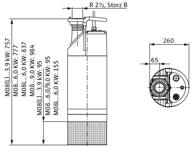 Całkowicie zanurzona pompa zatapialna do wody zanieczyszczonej, pionowe ustawienie mokre, do tłoczenia wody zanieczyszczonej i zawierającej piasek Korpus hydrauliczny z gumowanego aluminium, wirnik ze stali chromowej Duplex, korpus silnika z aluminium w płaszczu chłodzącym ze stali nierdzewnej. Przyłącze tłoczne z pionowym lub poziomym odpływem ciśnieniowym i złączem typu Storz. Chłodzony powierzchniowo silnik IE3 w wersji na prąd trójfazowy z termiczną kontrolą silnika i komorą uszczelnienia. Odłączany kabel zasilający z wyłącznikiem pływakowym i wtyczką zabezpieczenia silnika CEE. Uszczelnienie zapewniają dwa niezależne od kierunku obrotów uszczelnienia mechaniczne. Agregat można stosować w podsysającym trybie pracy bez ograniczeń.
