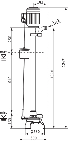 Pionowa pompa do wody brudnej w ścianie nienośnej do tłoczenia mediów o temperaturze maks. 95 oC, korpus hydrauliczny z żeliwa szarego, wirnik ze stali. Przyłącze tłoczne z poziomym odpływem ciśnieniowym i gwintem wewnętrznym. Napęd następuje poprzez silnik znormalizowany w wersji na prąd zmienny, korpus silnika z aluminium. Zabezpieczenie silnika i kabel zasilający zapewnia Użytkownik. Hydraulika i silnik są sztywno połączone za pomocą wału pompy (w rurze ochronnej wału). Łożyskowanie wału pompy następuje przez łożyska ślizgowe, smarowanie łożysk ślizgowych przez przetłaczane medium. Celem automatycznej pracy zamontowano wyłącznik pływakowy. Punkty przełączania można regulować za pomocą ograniczników.