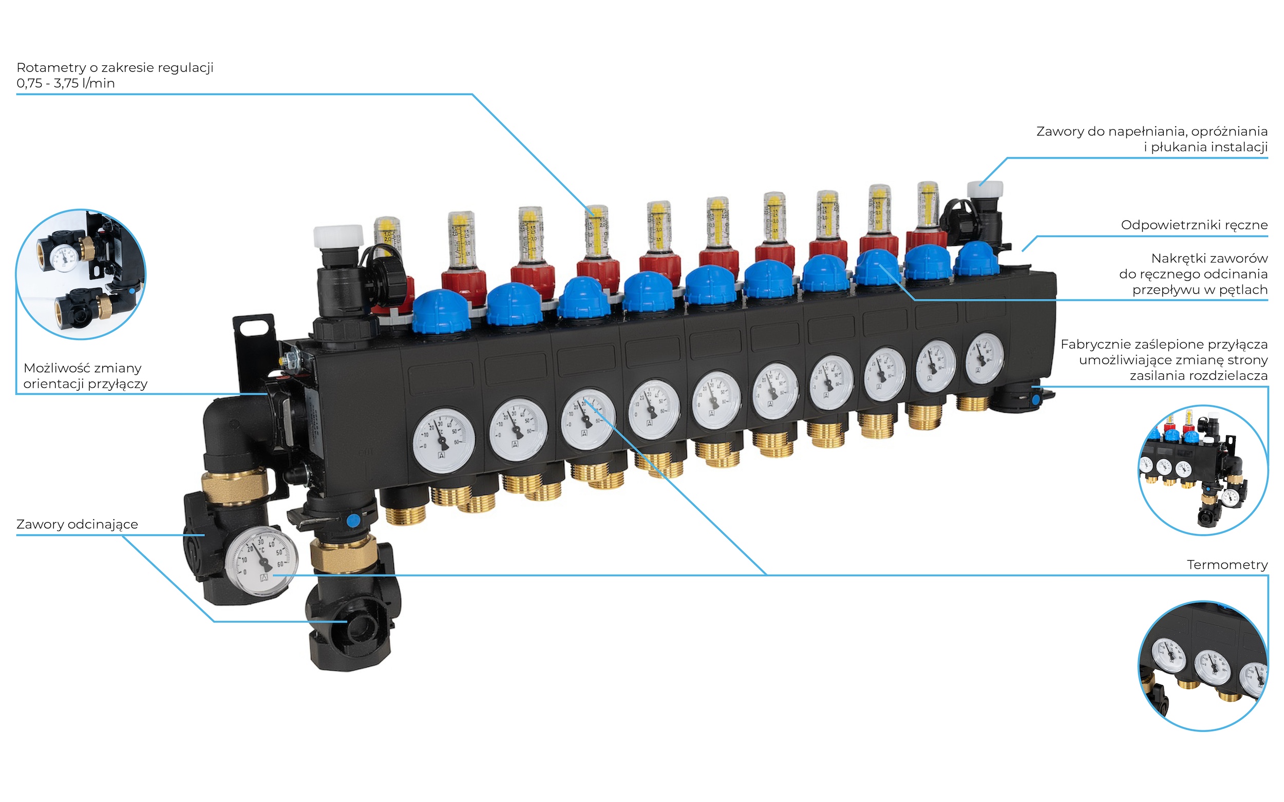 Rozprowadza ciepło / chłód ze źródła na poszczególne pętle instalacji płaszczyznowej.