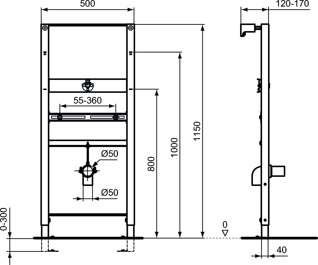 Instalacja: zabudowa podtynkowa z mocowaniem ściennym. Odporność na korozję i obciążenia do 130 kg. System montażu zapewniający szybką i łatwą instalację. Wsporniki z blokadą ułatwiającą montaż i regulacją wysokości w zakresie od 0 do 300 mm. Minimalna głębokość montażu 120 mm. Regulacja wysokości i rozstawu mocowania pisuaru. Elementy w komplecie: Standardowy zestaw montażowy do pisuaru. Kompletny zestaw montażowy, wraz ze wspornikami ściennymi. Kolano rury odpływu. Przyłacza kątowe do baterii G ½ - 1 szt.