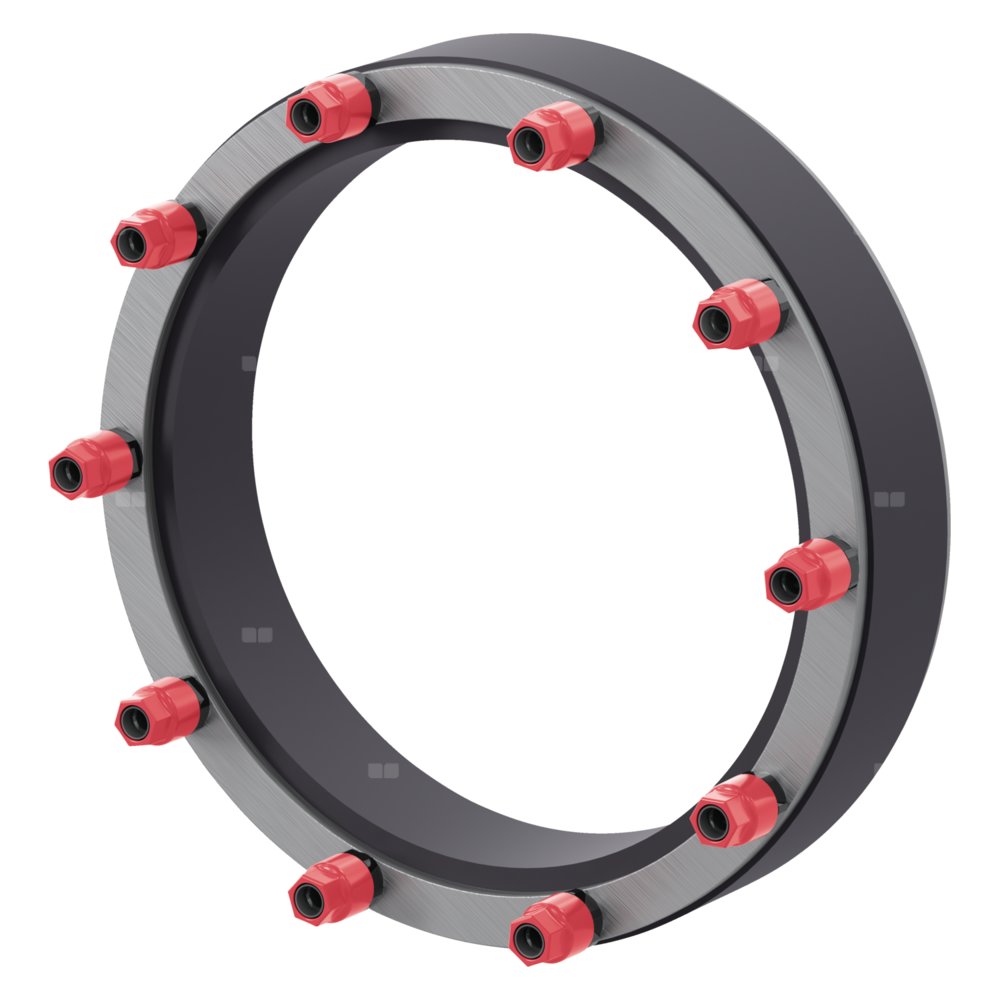 Przepust ścienny do podziemnych przewodów zasilających i powrotnych oraz dwóch pustych kanałów zasilających w ścianach betonowych („biały zbiornik”) lub w obudowie betonowej. Wkładka uszczelniająca do połączenia z rurą KG/HT DN 200, odpowiednia do otworów rdzeniowych lub rur osłonowych o średnicy wewnętrznej 250 mm. Łatwy montaż dzięki regulacji momentu obrotowego za pomocą nakrętek mocujących. Zamknięcie przestrzeni pierścieniowej między rurą KG/HT a rurą odwiertu/rurą okładzinową. Wodoszczelność do 3 barów.