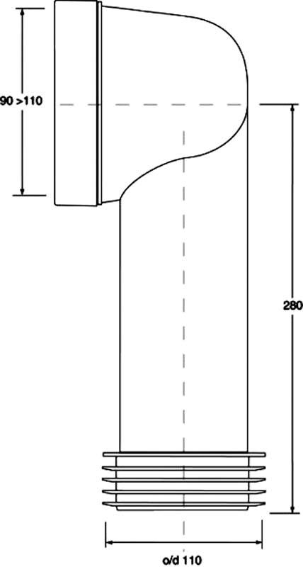 Przyłącze kanalizacyjne długie, L-280mm. Kąt 90 stopni. Wejście 90-110mm z uszczelką wargową, wyjście 110mm z uszczelką kołnierzową.