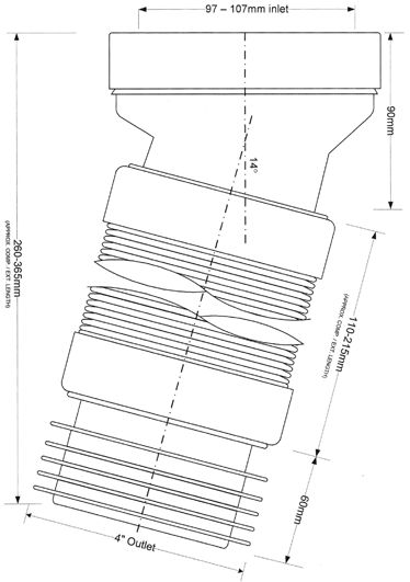 Przyłącze kanalizacyjne elastyczne kątowe 140 , o długości od 260 do 365mm. Wejście 90-110mm z uszczelką wargową, wyjście 110mm z uszczelką kołnierzową.