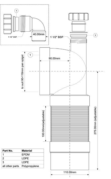 Przyłącze kanalizacyjne elastyczne, o długości od 265 do 540mm, kątowe 900, z odejściem 40mm. Wejście 90-110mm z uszczelką wargową, wyjście 110mm.