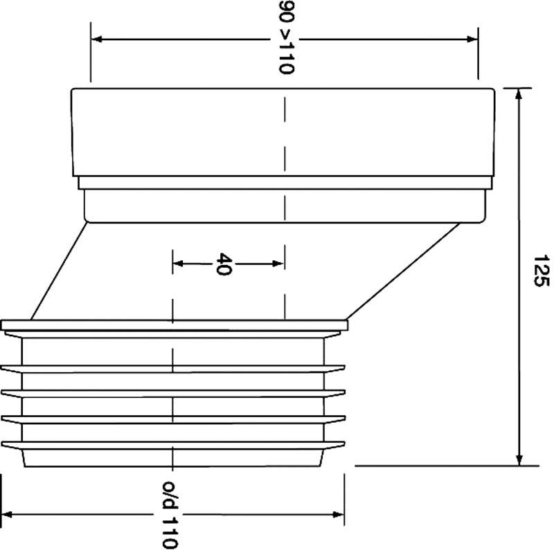 Przyłącze kanalizacyjne krótkie, L-125mm. Mimośrodowe przesunięcie 40mm. Wejście 90-110mm z uszczelką wargową, wyjście 110mm z uszczelką kołnierzową.