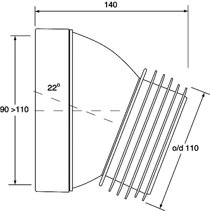 Przyłącze kanalizacyjne krótkie, L-140mm. Kąt 22 stopni. Wejście 90-110mm z uszczelką wargową, wyjście 110mm z uszczelką kołnierzową.