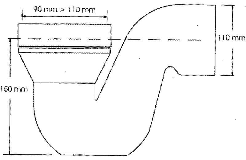 Przyłącze kanalizacyjne do tzw.WC Tureckich z zasyfonowaniem z odejściem poziomym. Wejscie 90-110mm z uszczelką wargową, wyjście 110mm z uszczelką kołnierzową.