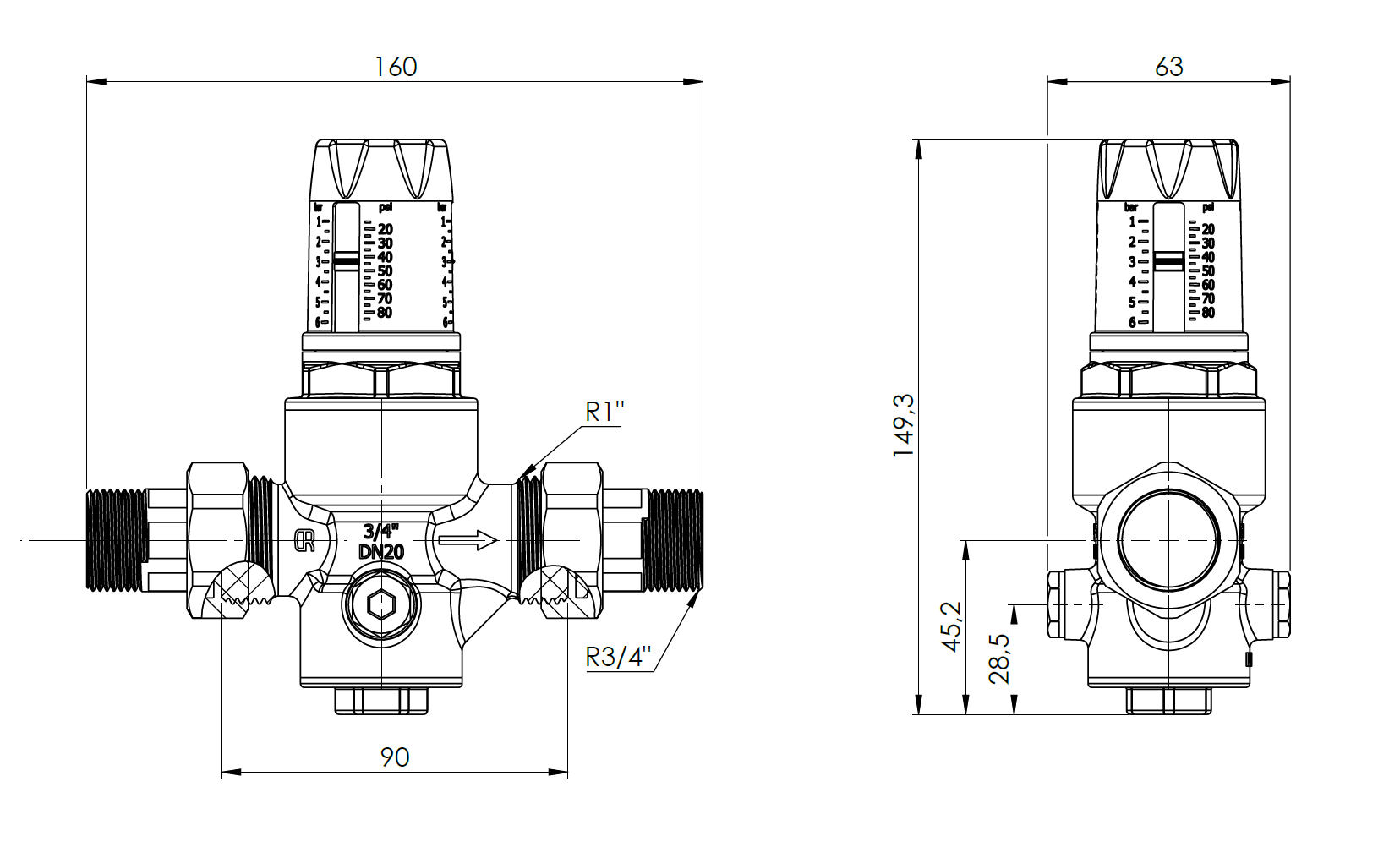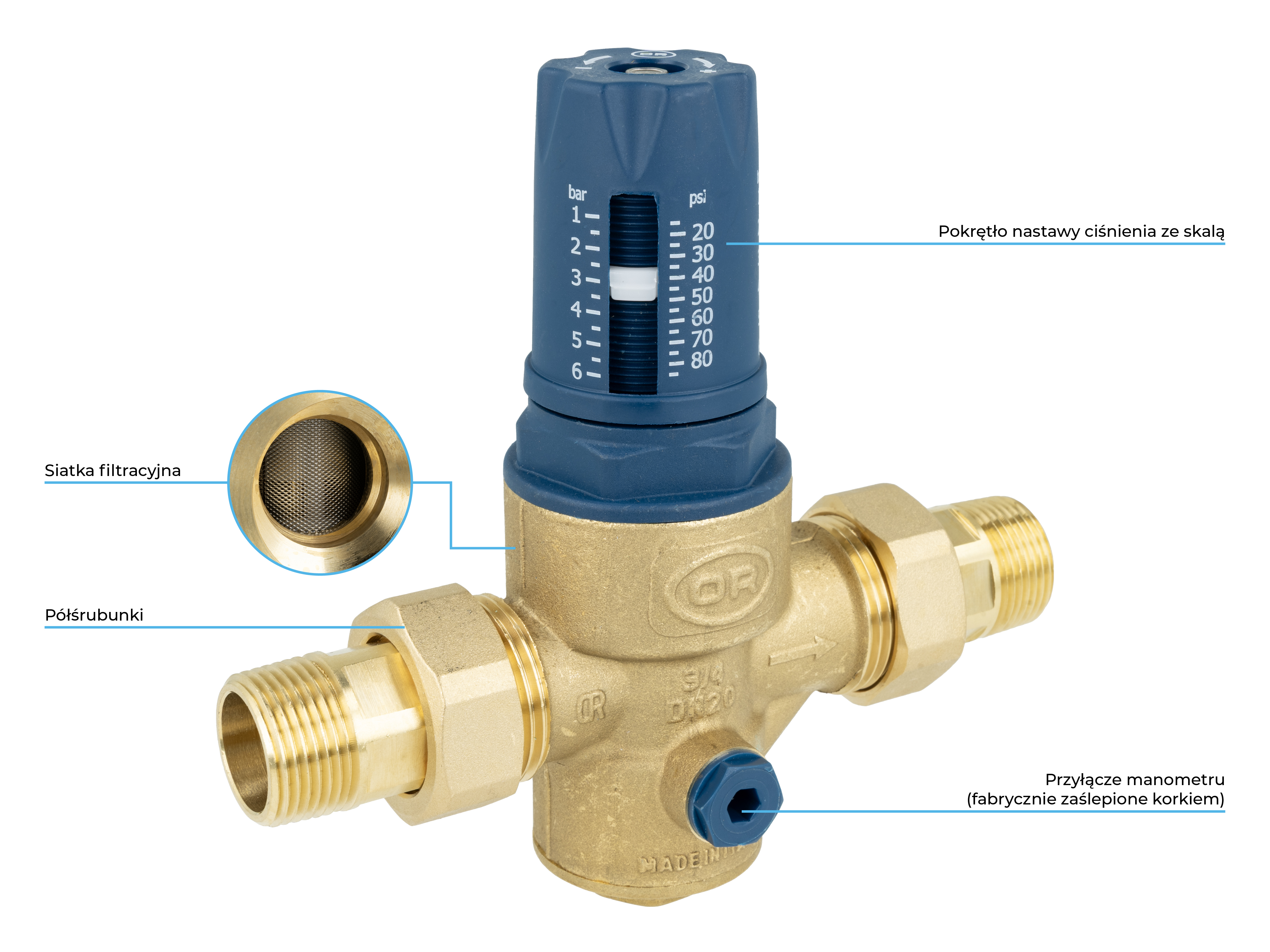 Obniża i stabilizuje ciśnienie wody do ustawionej wartości niezależnie od zmian ciśnienia na wlocie do reduktora.