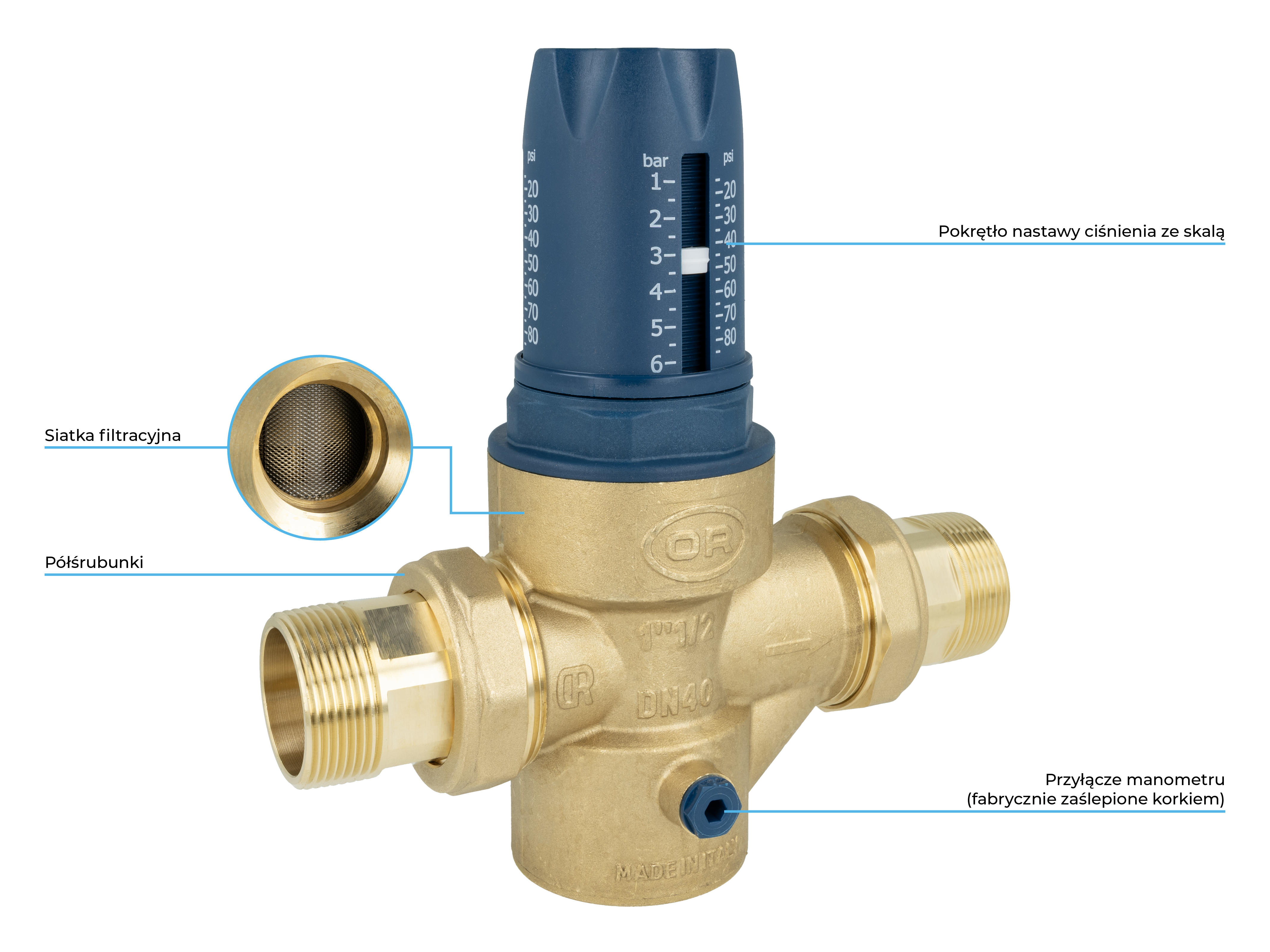 Wbudowany filtr siatkowy o średnicy oczek 500 μm chroni reduktor przed zanieczyszczeniami.