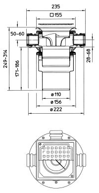 Regulowany wpust łazienkowy, ruszt kwadratowy, odpływ pion DN =110 mm, 3 dopływy boczne, stal kwasoodporna
