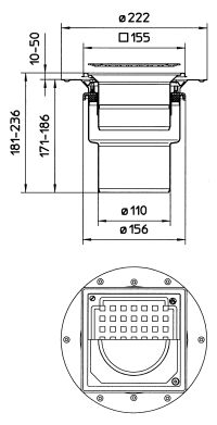 Regulowany wpust łazienkowy, ruszt kwadratowy, odpływ pion DN =110 mm, stal kwasoodporna