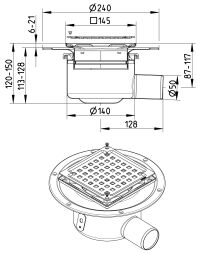 Regulowany wpust łazienkowy, ruszt kwadratowy, odpływ poziom DN =50 mm, z kołnierzem do podłóg z izolacją, stal kwasoodporna