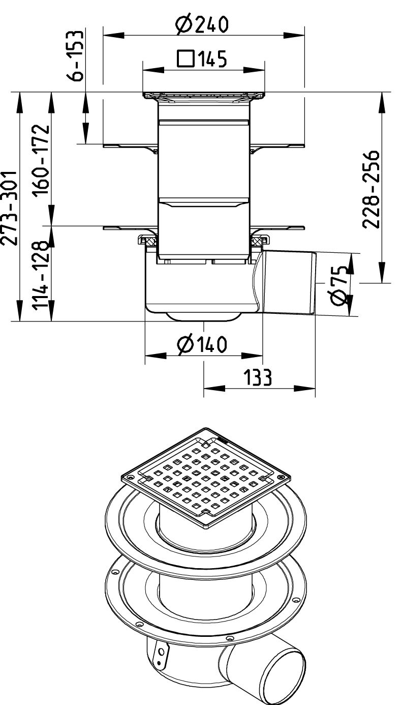 Regulowany wpust łazienkowy, ruszt kwadratowy, odpływ poziom DN =75 mm, z podwójnym kołnierzem do podłóg z izolacją