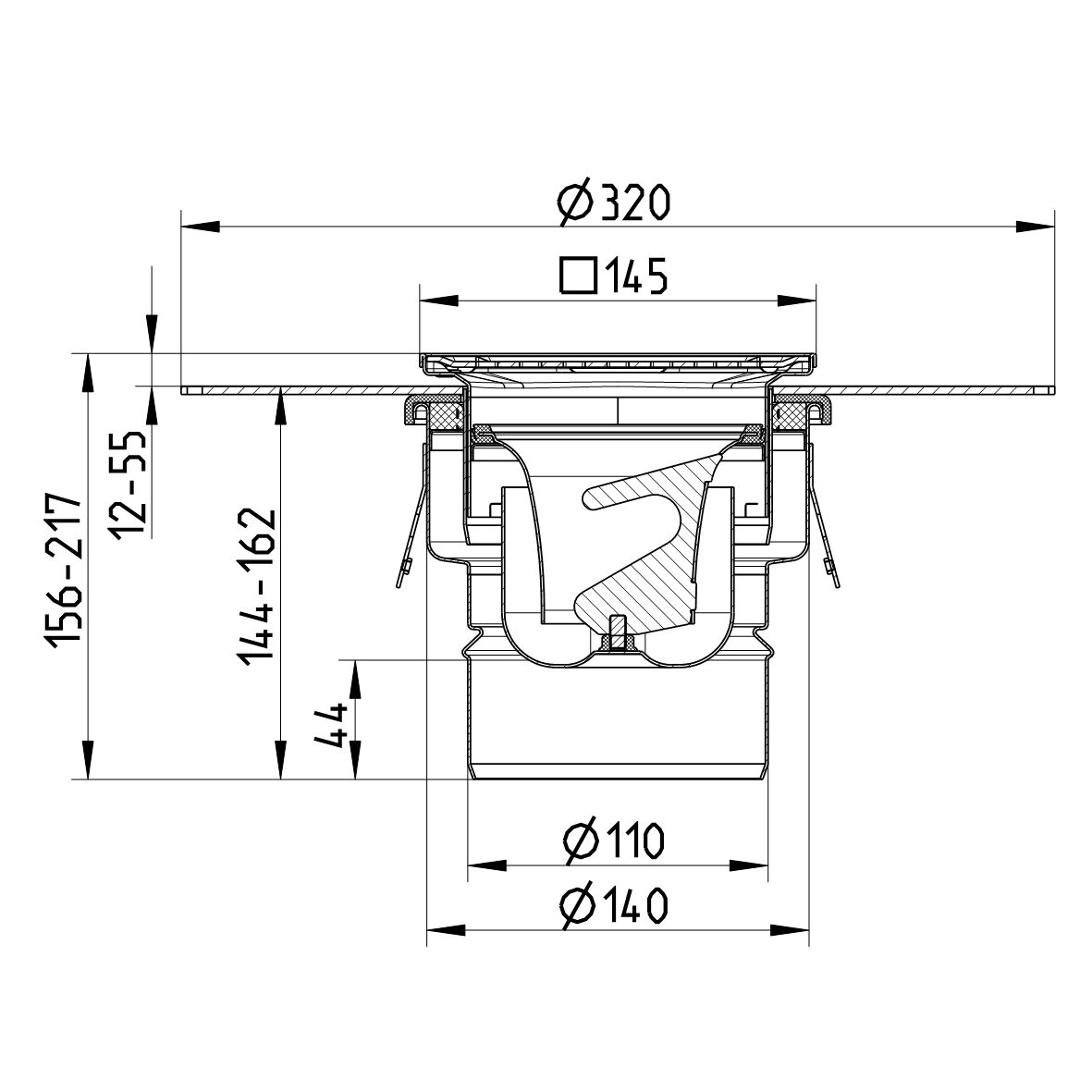 Regulowany wpust łazienkowy, ruszt kwadratowy, z kołnierzem do izolacji, odpływ pion DN =110 mm z syfonem w zestawie