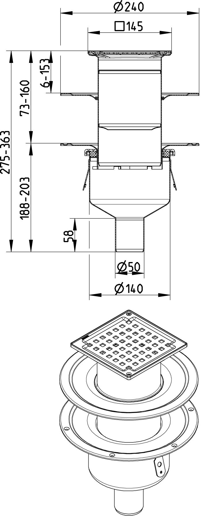 Regulowany wpust łazienkowy, ruszt kwadratowy, z podwójnym kołnierzem do izolacji, odpływ pion DN =50 mm