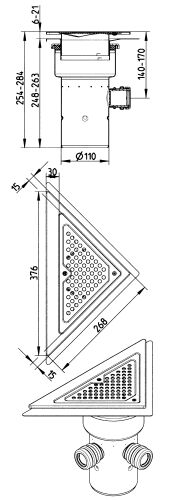 Regulowany wpust łazienkowy TRIO, ruszt trójkątny, odpływ pion DN =110 mm, 3 dopływy boczne, kołnierz do izolacji, do montażu wzdłuż ściany