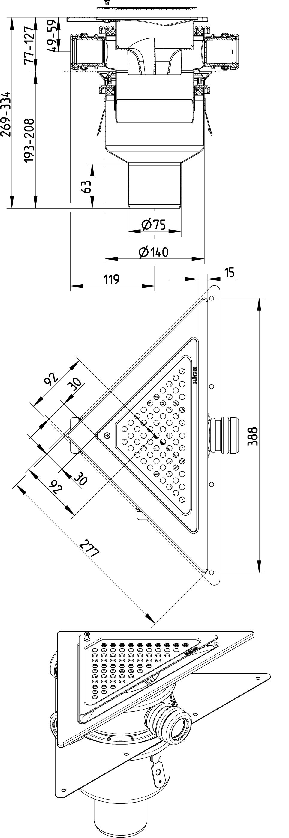 Regulowany wpust łazienkowy TRIO, ruszt trójkątny, odpływ pion DN =75 mm, 3 dopływy boczne, kołnierz do izolacji