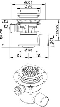 Regulowany wpust MULTI, odpływ poziom DN =75 mm, ruszt okrągły, zintegrowany syfon, 2 dopływy boczne DN =50 mm, do podłóg winylowych