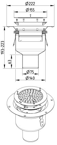 Regulowany wpust, odpływ pion DN =75 mm, ruszt okrągły, do podłóg winylowych, stal kwasoodporna
