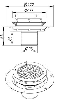 Regulowany wpust, odpływ pion DN =75 mm, ruszt okrągły, niski model, do podłóg winylowych, syfon wykluczony, stal kwasoodporna