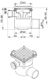 Regulowany wpust prysznicowy, kwadratowy 145x145 odpływ poziomy DN =75 mm, 3 boczne dopływy DN =50 mm