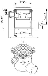 Regulowany wpust prysznicowy, kwadratowy 145x145 odpływ poziomy DN =75 mm, 3 boczne dopływy