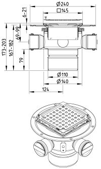 Regulowany wpust, ruszt kwadratowy, odpływ pion DN =110 mm, z 3 dopływy boczne DN =50 mm