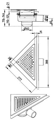 Regulowany Wpust TRIO, trójkatny, odpływ poziom, odpływ fi 50 mm, z kołnierzem do izolacji, niski model