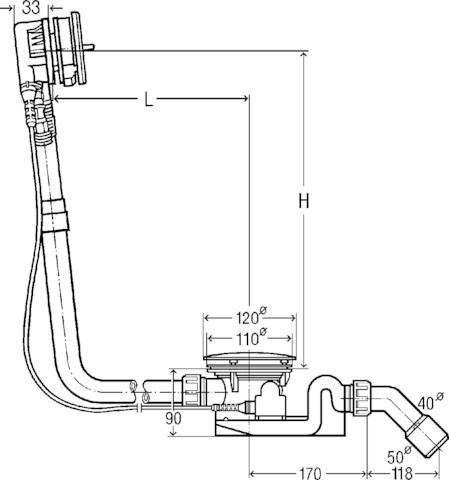 Rotaplex Trio-komplet odpływowo-przelewowy, Visign RT3, płaskie wykonanie: tylko 33 mm wymaganego miejsca z tyłu wanny. Przeznaczenie: dopływ wody przez korpus armatury przelewowej. Wyposażenie: Pokrętło chromowane, osłona dopływu chromowana, kołpak chromowany, kołnierz dopływowy, syfon, łuk odpływowy 45°. Wyposażenie: Pokrętło chromowane, osłona dopływu chromowana, kołpak chromowany, kołnierz dopływowy, syfon, łuk odpływowy 45° bez możliwości klejenia. Dane techniczne: wysokość zamknięcia wodnego 50 mm, wydajność odpływu przy wysokości spiętrzenia 300 mm 1,25 l/s, wydajność przelewu wysokość spiętrzenia 60 mm nad środkiem otworu przelewowego 0,63 l/s. Wskazówka: Patrz aktualny przegląd wskazówek dotyczących zastosowania!, wg PN-EN 274, nr wzoru 6141.61, nr kat. 727 666, DN: 40/50 długość cięgna Bowdena: 725 L: 150-400 H: 180-430 wanna z odpływem pośrodku, do wanien z otworem odpływowym Ø 90,