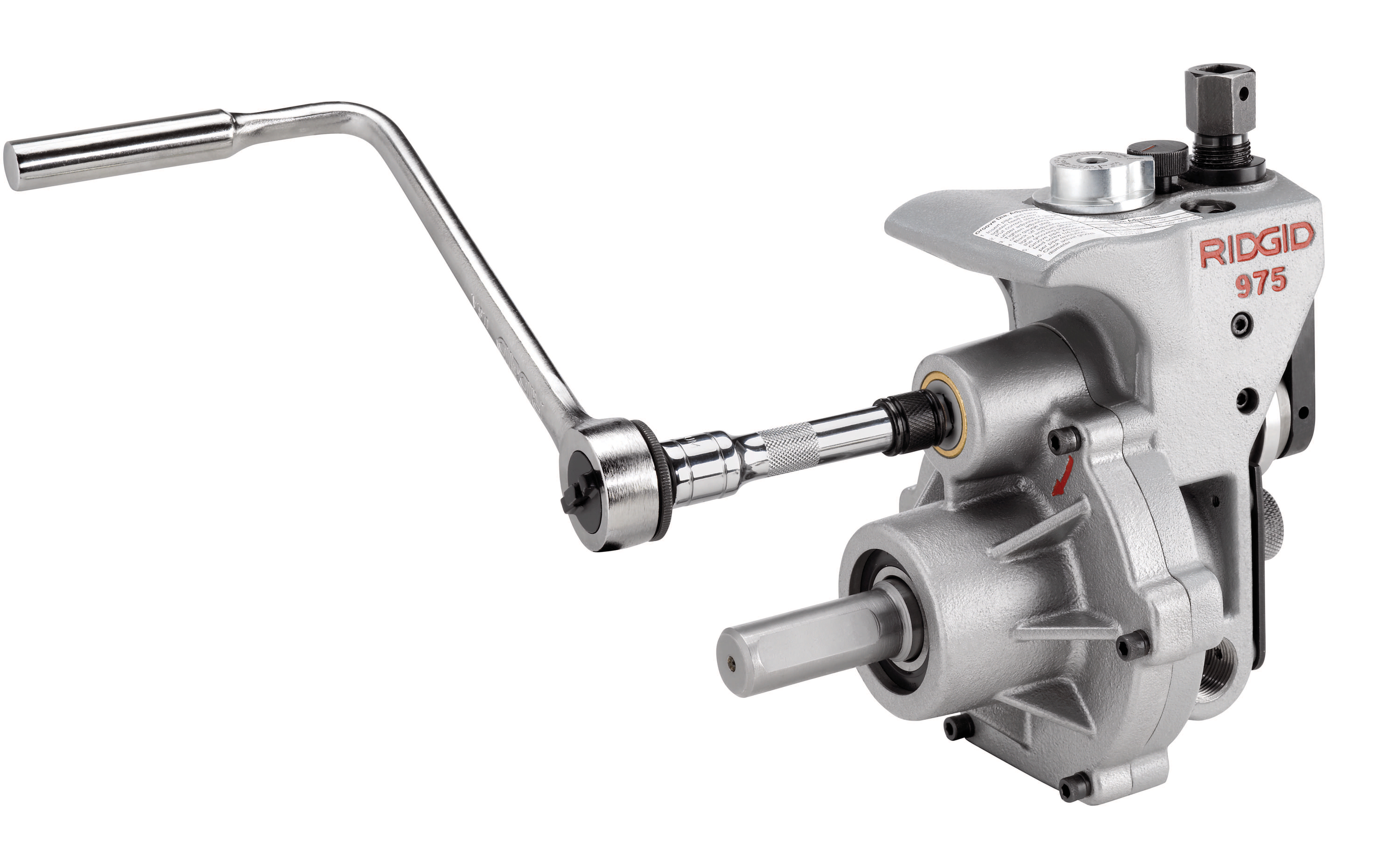 Automatyczne prowadzenie i nastawnik głębokości umożliwiają łatwiejszą obsługę - W rowkarce 975 Combo zastosowano nową, opatentowaną technologię automatycznego prowadzenia, która znacznie ułatwia rowkowanie. Przy rowkowaniu maszynowym czy ręcznym wskaźnik automatycznego prowadzenia zapewnia automatyczne utrzymywanie rury w rowkarce podczas procesu rowkowania. Rowkarka 975 jest także wyposażona w stały nastawnik głębokości, który przyśpiesza przygotowanie do pracy i zwiększa powtarzalność ustawienia. Wymaga mniejszej siły rąk - Przy ręcznym rowkowaniu rolkowym wyższa o 55% redukcja przełożenia w rowkarce 975 oznacza mniejszą wymaganą siłę rąk w porównaniu do ręcznych rowkarek rolkowych konkurencji. Jest to szczególnie pomocne przy rowkowaniu rolkowym elementów podwieszonych. Trwałość i łatwość przenoszenia - Dzięki budowie z wytrzymałego żeliwa sferoidalnego rowkarka 975 jest odporna na przeciążenia podczas pracy i za każdym razem tworzy dokładne rowki. Dzięki zintegrowanemu uchwytowi rowkarka 975 jest łatwa w przenoszeniu. Zakres - Rury stalowe, aluminiowe i PCW 1 ¼"–6" grubość ścianki 10 i 40. Rury ze stali nierdzewnej 1 1/4"–6" grubość ścianki 10, 1 1/4"–2" grubość ścianki 40; rury z PCW 1 1/2"–3" grubość ścianki 80. Rury miedziane od 2"–8" (typ K, L, M, DWV) po zmianie rolek. Regulacja głębokości - Śruba do regulacji oraz integralny miernik głębokości. Posuw - Śruba pociągowa z kluczem grzechotkowym 1/2" (w zestawie) lub kluczem sześciokątnym 15/16". Montaż gwinciarki mechanicznej - Jednostka napędowa RIDGID 300 38/57 obr./min. (tylko kierunek wsteczny).