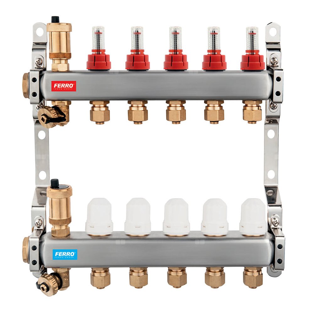 Rozdzielacz 10-drogowy z zaworami termostatycznymi, przepływomierzami i złączkami, stal nierdzewna
