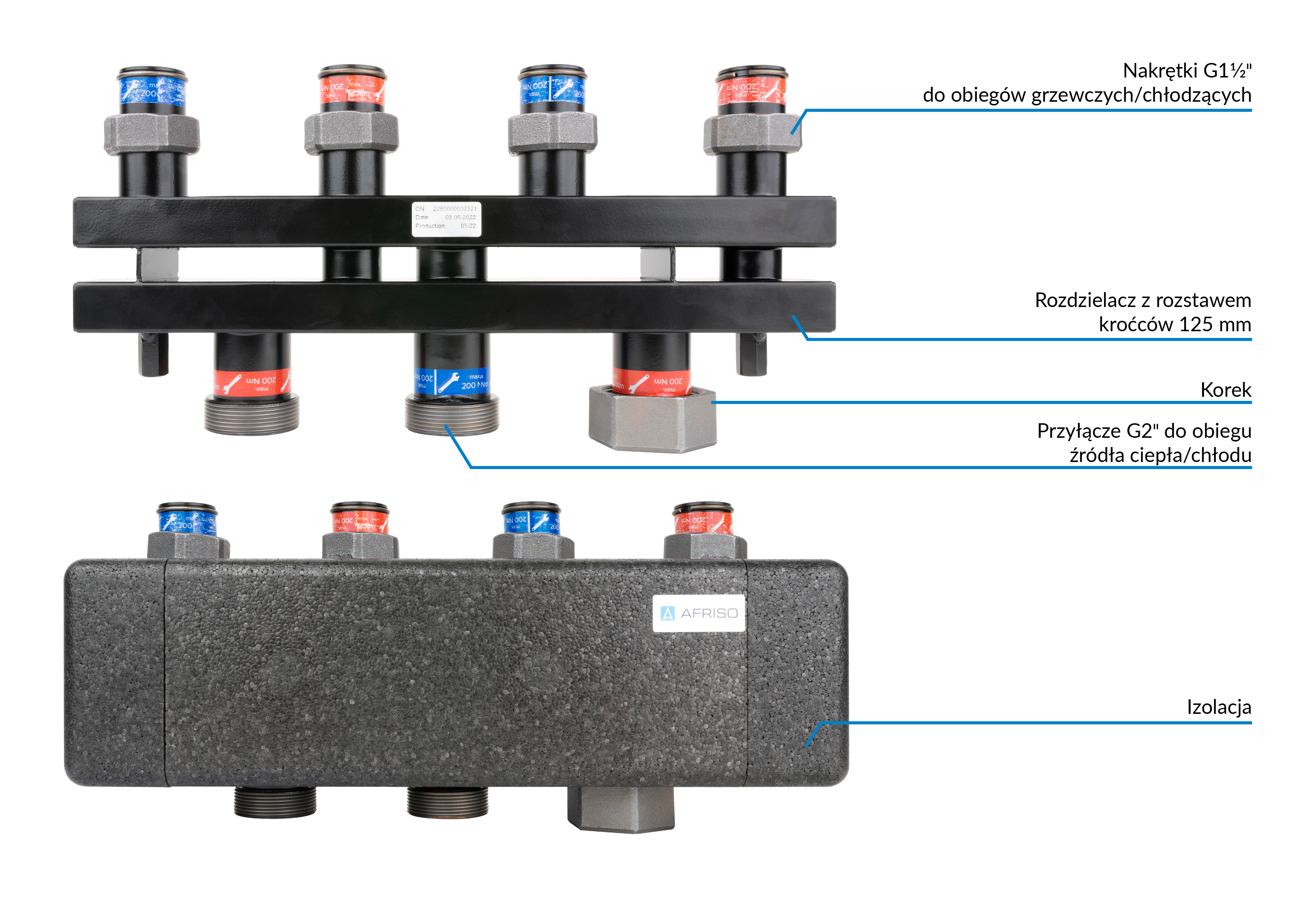 Rozdzielacz do instalacji c.o. AFRISO KSV 125-2 GZ 2'', 2-obieg. Nakrętka 1 1/2'', max. 160 kW