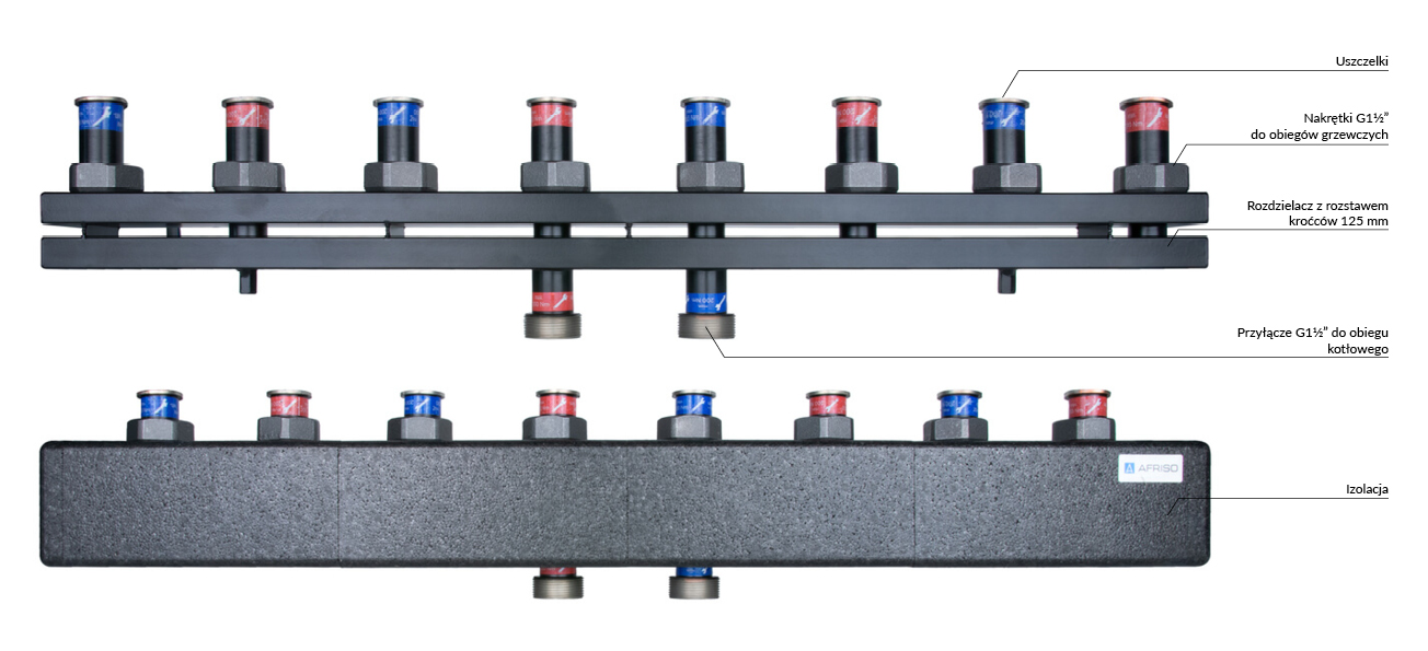 Rozdzielacz do instalacji c.o. AFRISO KSV 125-4 GZ 1 1/2'', 4-obieg. Nakrętka 1 1/2'', max. 70 kW