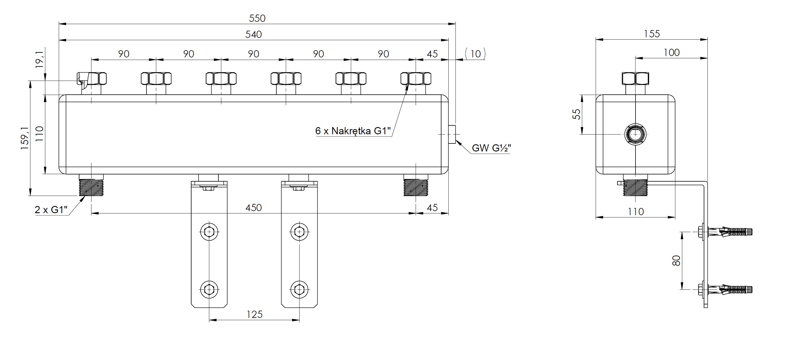 - Przyłącze boczne GW G1/2" umożliwia wkręcenie tulei na czujnik temperatury.