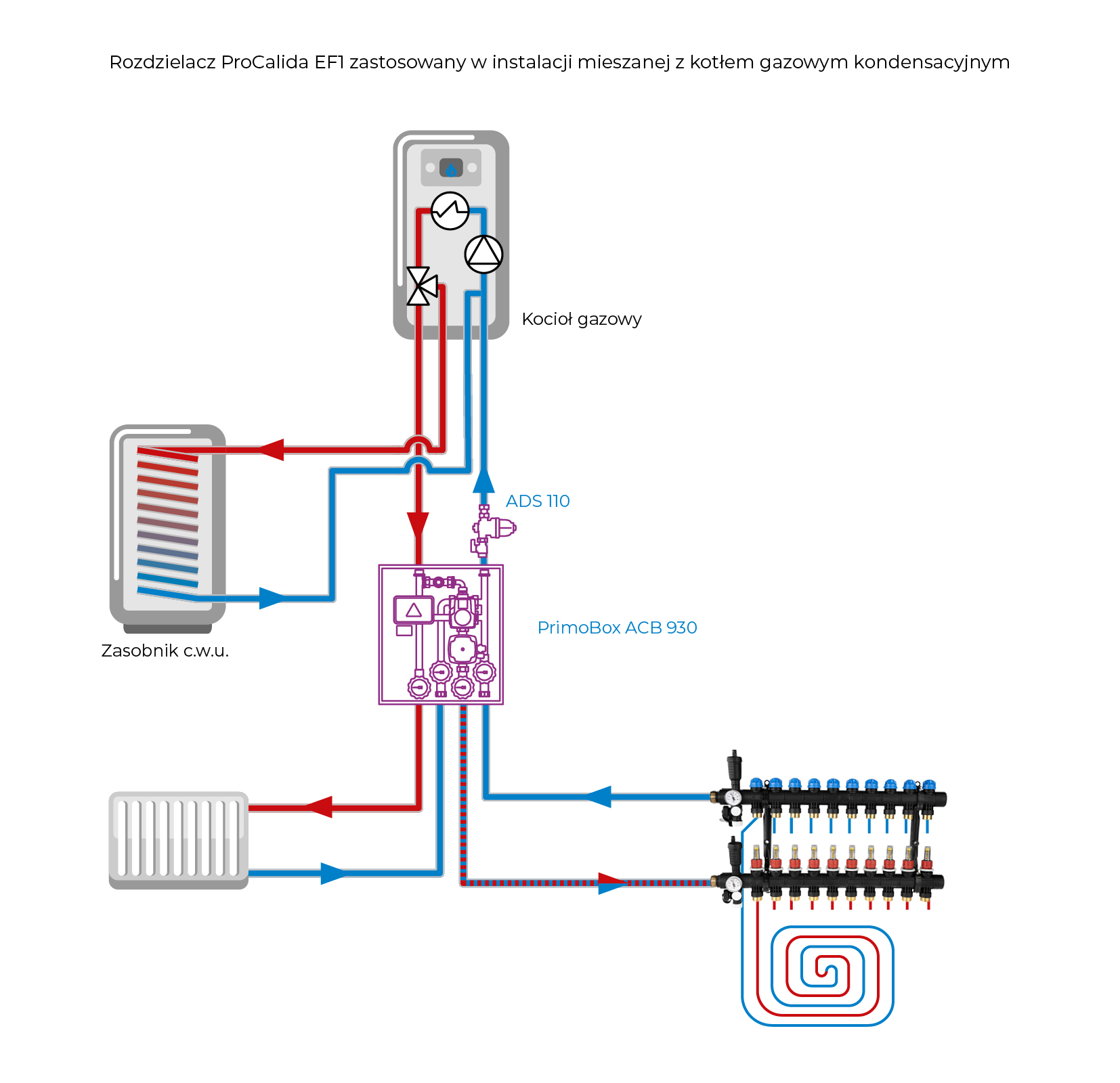 Rozprowadza ciepło/chłód ze źródła na poszczególne pętle instalacji płaszczyznowej.
