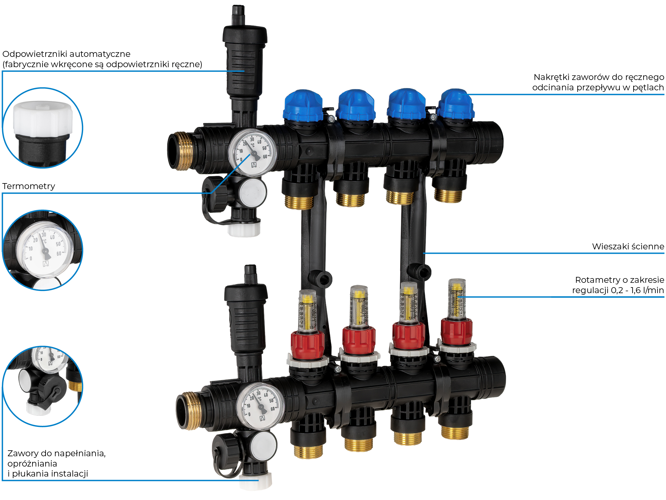Termometry na każdej belce umożliwiają kontrolę temperatury na zasilaniu i powrocie.