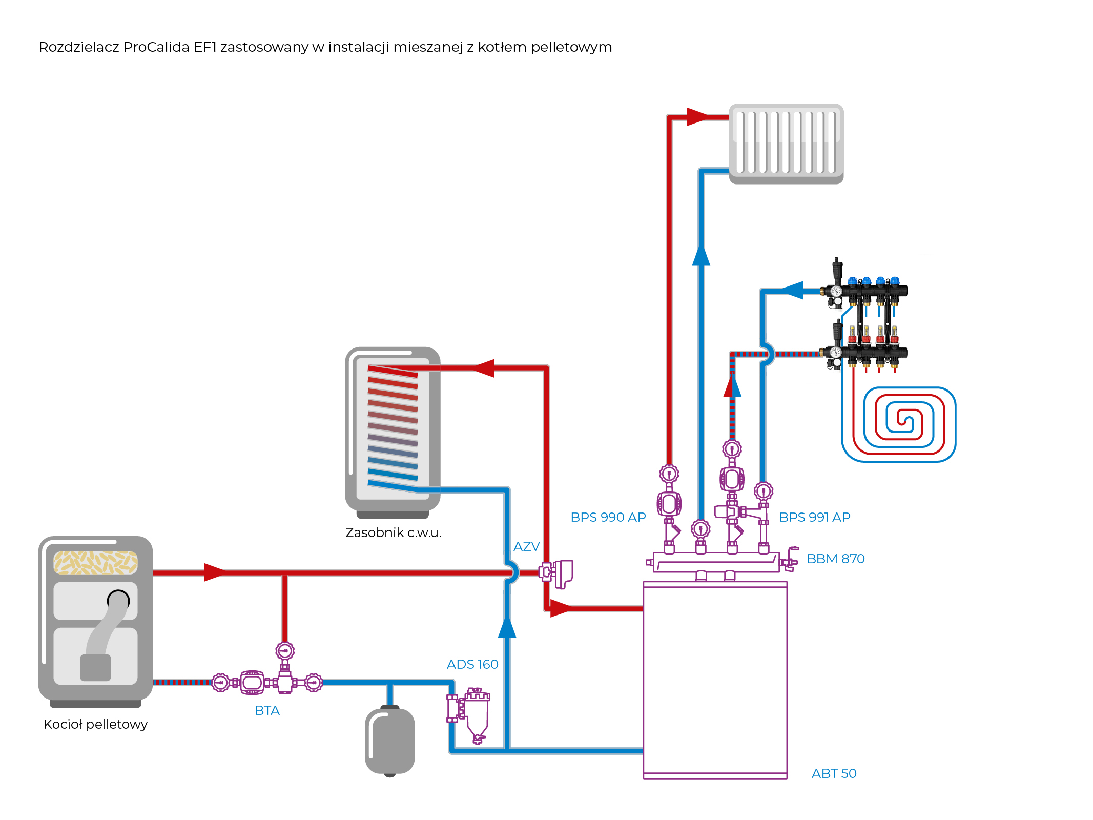 Rozprowadza ciepło/chłód ze źródła na poszczególne pętle instalacji płaszczyznowej.