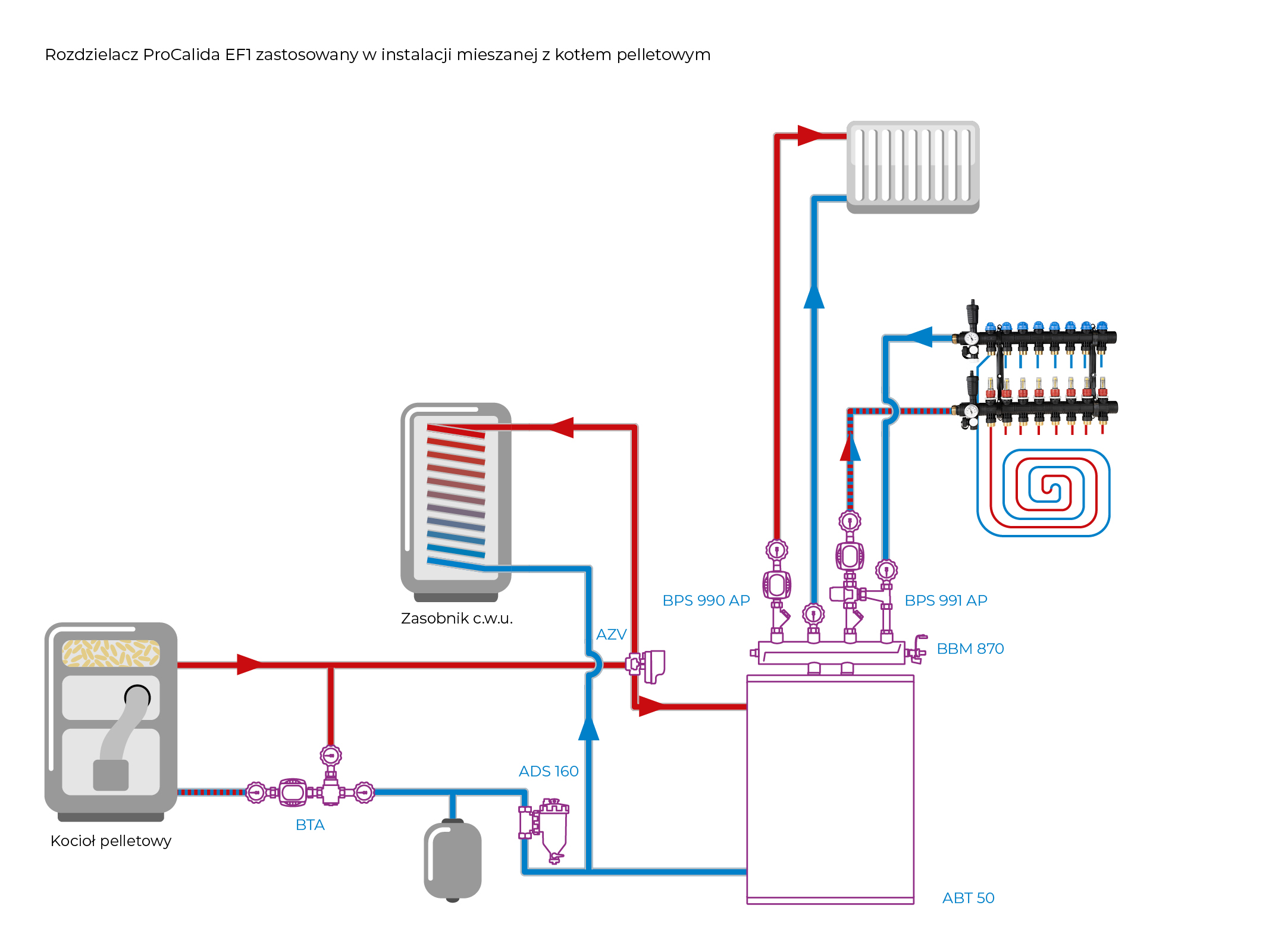 Rozprowadza ciepło/chłód ze źródła na poszczególne pętle instalacji płaszczyznowej.