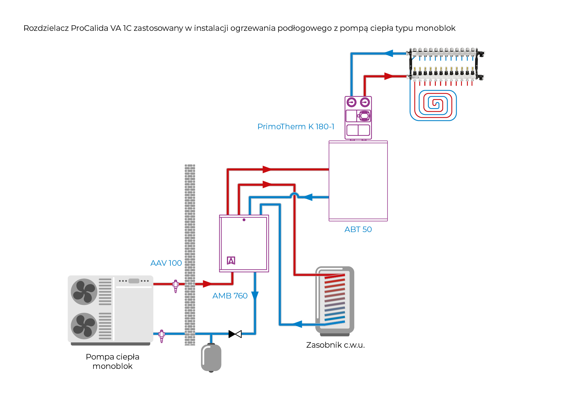 Rozprowadza ciepło/chłód ze źródła na poszczególne pętle instalacji płaszczyznowej.