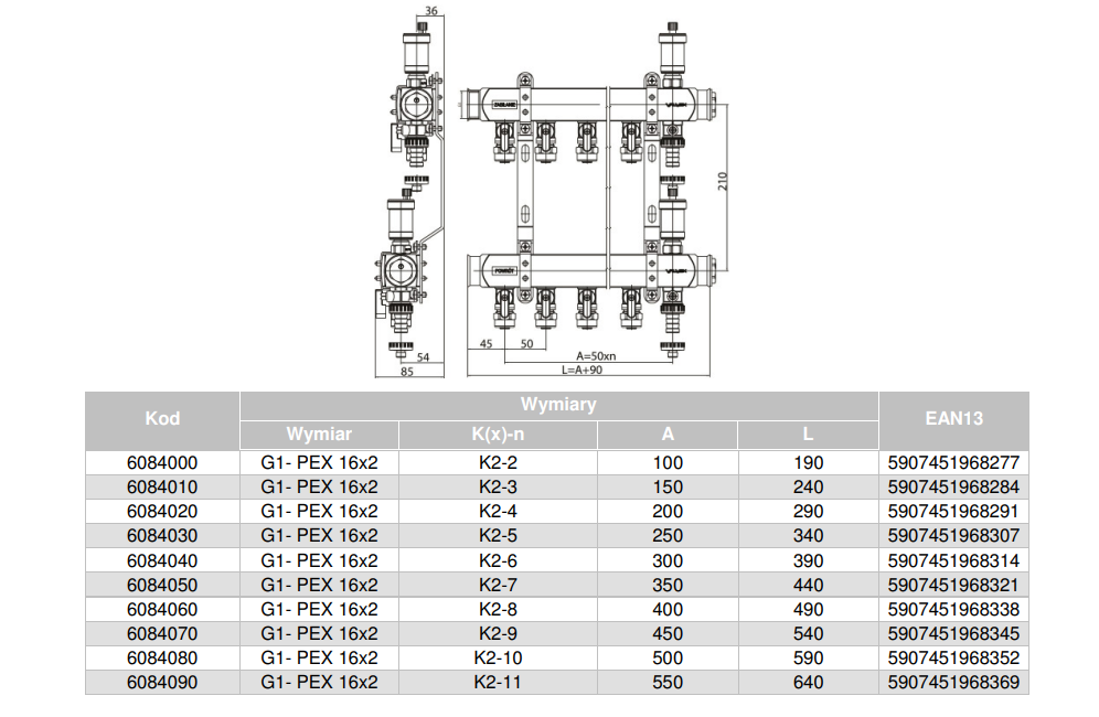 Rozdzielacz hydrauliczny VALVEX Base K2MINI-11 stal niedzewna, odgałęzień: 11 (1/2''), do CO + zawory odcinające