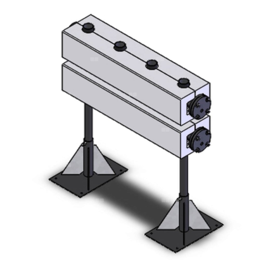 Moduły rozdzielacza z oddzielonymi termicznie komorami (zasilanie i powrót). Moduły posiadają boczne, kołnierzowe przyłączenia PN 6, do obwodu kotła albo dalszych modułów rozdzielczych, gwinty zewnętrzne 2" do podłączenia obiegów grzewczych. Zawiera stalowe podstawy o regulowanej wysokości, izolację, śruby, zaślepki. System rozdzielacza zbudowany jest z modułów dwu- lub trzyobwodowych z możliwością kombinacji do zabudowania określonej przez klienta ilości grup pompowych (obiegów grzewczych).