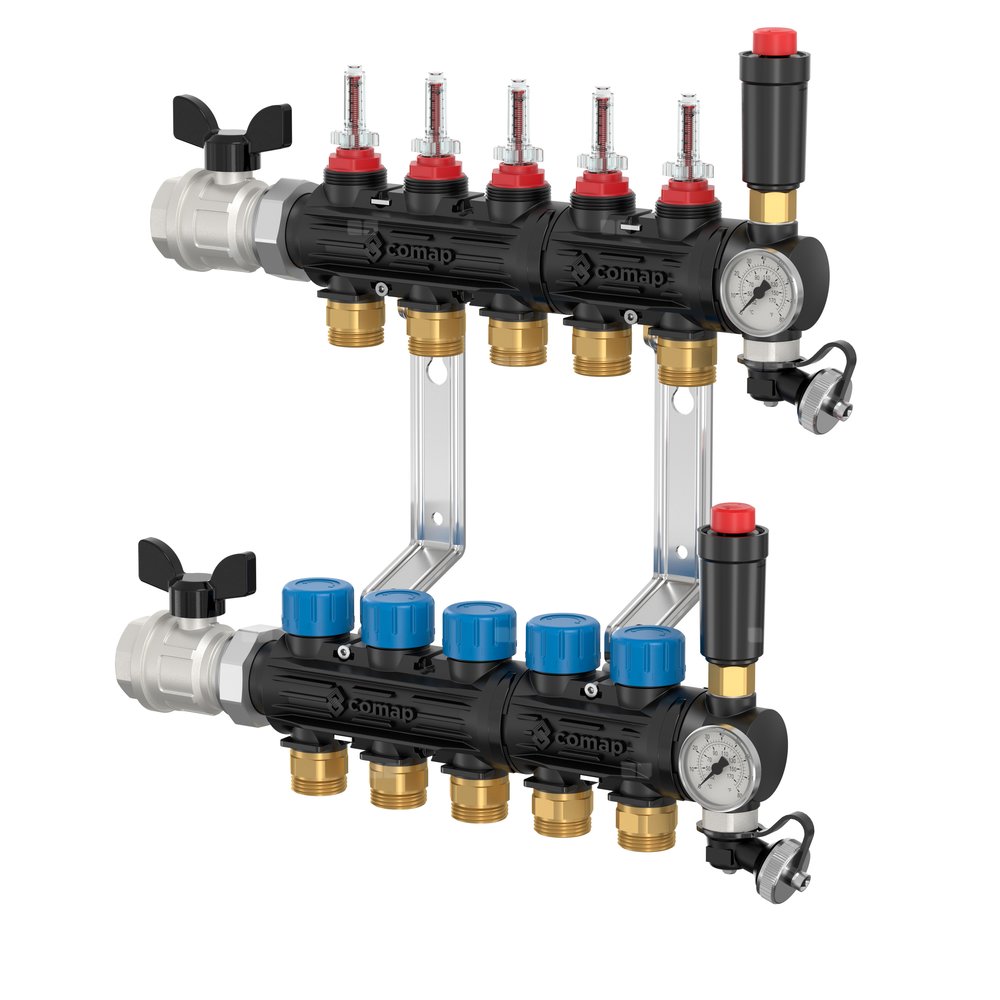 Modułowy, syntetyczny rozdzielacz przeznaczony do systemów ogrzewania i chłodzenia podłogowego. Składa się z indywidualnych modułów hydraulicznych, które można łatwo zdemontować, co zapewnia maksymalną elastyczność systemu oraz oszczędność czasu podczas montażu na miejscu. W zestawie: • Przepływomierz 0-2,5 l/min. dla każdego obwodu • Mechanizm termostatyczny M30x1.5 z dołączoną zaślepką ochronną • 2x zawory kulowe 1 1/4" M x 1" F • 2x termometr • 2x Flovent (automatyczny odpowietrznik) • 2x zawór spustowy z metalową nakrętką • 2x metalowy wspornik mocujący ze śrubami i kołkami Zalety: Wielopozycyjność: W pełni modułowy i odwracalny – lewo/prawo oraz góra/dół. Dzięki zestawom rozszerzeniowym, możliwe jest łatwe i szybkie dodawanie lub usuwanie obwodów w razie potrzeby, co zapewnia dużą elastyczność systemu. Długa żywotność: Charakteryzuje się doskonałymi właściwościami izolacyjnymi oraz odpornością na korozję, co zapewnia niezawodność przez długi czas użytkowania. Jakość materiałów została potwierdzona przez 2500 godzin testów na wewnętrznym stanowisku badawczym. Dodatkowo, połączenia metalowe ułatwiają instalację oraz późniejszą konserwację. Wydajność: Przepływomierze charakteryzują się wysoką precyzją dzięki nowemu dyskowi pomiarowemu. Dzięki krzyżowemu kształtowi łatwo je uchwycić i precyzyjnie regulować, zapewniając równomierny przepływ w każdym obwodzie. Dostępny od 2 do 12 obwodów. Przyłącze ¾ Eurokonus. Przyłącze wlotowe/wylotowe 1” F do zaworu kulowego. Produkt dostarczony gotowy do montażu na wsporniku rozdzielacza, zgodnie z normami EN1264 i DIN4725.
