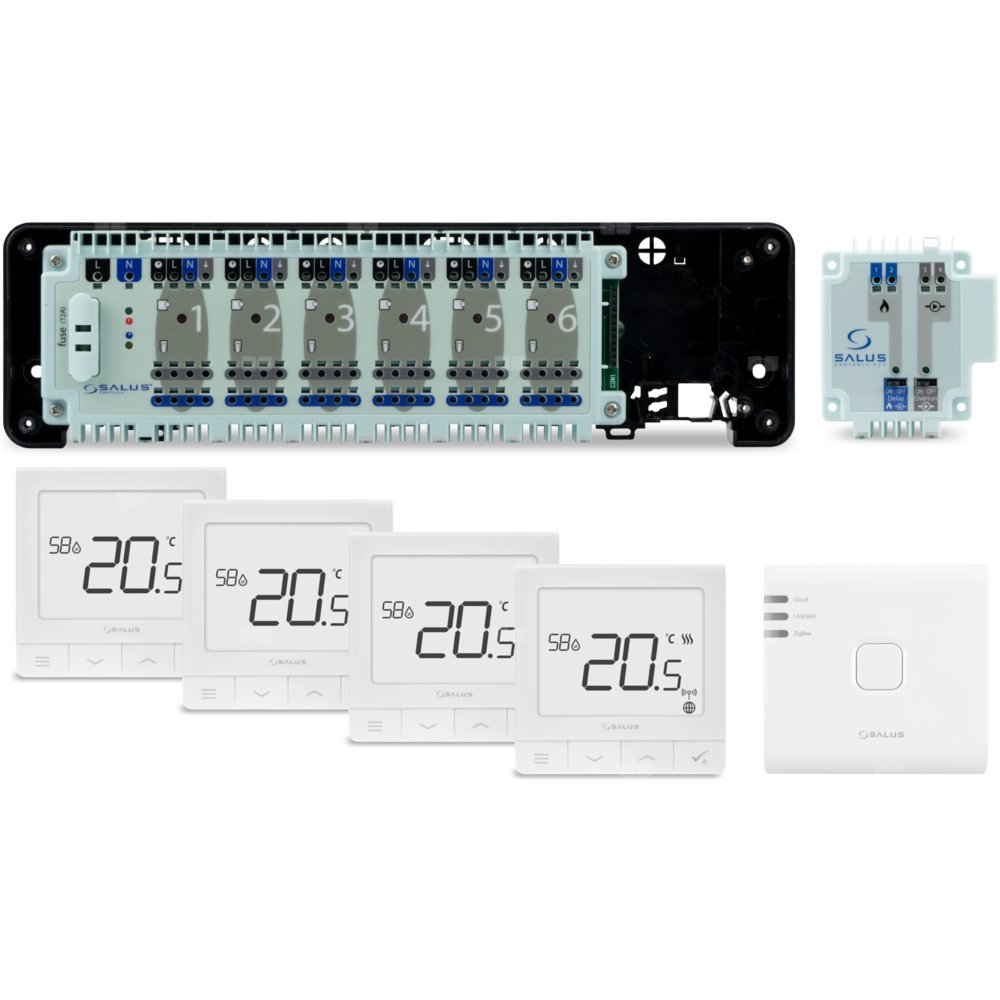 SALUS StartPack Premium - zestaw przewodowego sterowania ogrzewaniem podłogowym z zarządzaniem przez Internet: KL06-M, PL07, UG800, 4 xSQ610