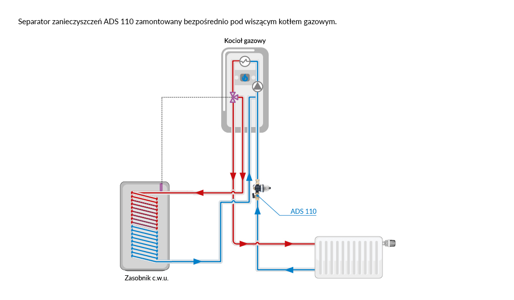 Trzy przyłącza pozwalają na pionowy, poziomy oraz kątowy montaż separatora. Kompaktowe rozmiary umożliwiają bezpośredni montaż pod wiszącym źródłem ciepła.