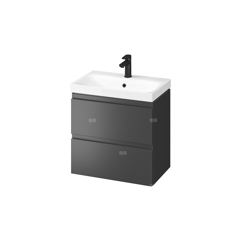 Front szafki wykonany został z płyty MDF, lakierowanej na kolor antracytowy o wykończeniu matowym. Szafka posiada wygodne, frezowane uchwyty i system cichego domykania.