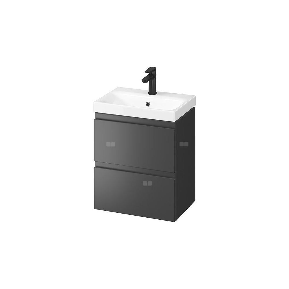 W skład zestawu wchodzi szafka podumywalkowa MODUO SLIM w wersji zmontowanej oraz umywalka ceramiczna MODUO SLIM 50. Dzięki zmniejszonej głębokości, zestaw można zamontować nawet w wąskich pomieszczeniach. Front szafki wykonany został z płyty MDF, lakierowanej na kolor antracytowy o wykończeniu matowym. Szafka posiada wygodne, frezowane uchwyty i system cichego domykania.