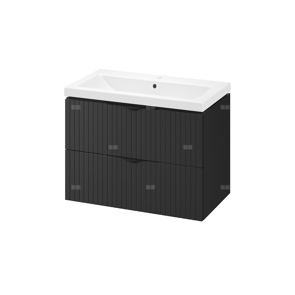 W skład zestawu wchodzi szafka podumywalkowa TIRSO 80 w wersji DSM oraz umywalka ceramiczna COMO 80. Szafka wyposażona w dwie pojemne szuflady z pełnym dnem, zapewniające więcej miejsca do przechowywania różnych akcesoriów łazienkowych - w związku z tym rekomendujemy zastosowanie syfonu oszczędzającego miejsce. Front szafki wykonany jest z ryflowanej płyty MDF foliowanej w matowej wersji, co nadaje jej subtelną fakturę i elegancki wygląd. Korpus szafki to płyta wiórowa laminowana, również w matowym wykończeniu. Prostokątna umywalka ceramiczna COMO 80 posiada otwór na armaturę i przelew w centralnej części, moze być skompletowana z korkami klik-klak ceramicznymi lub metalowymi z oferty Cersanit.