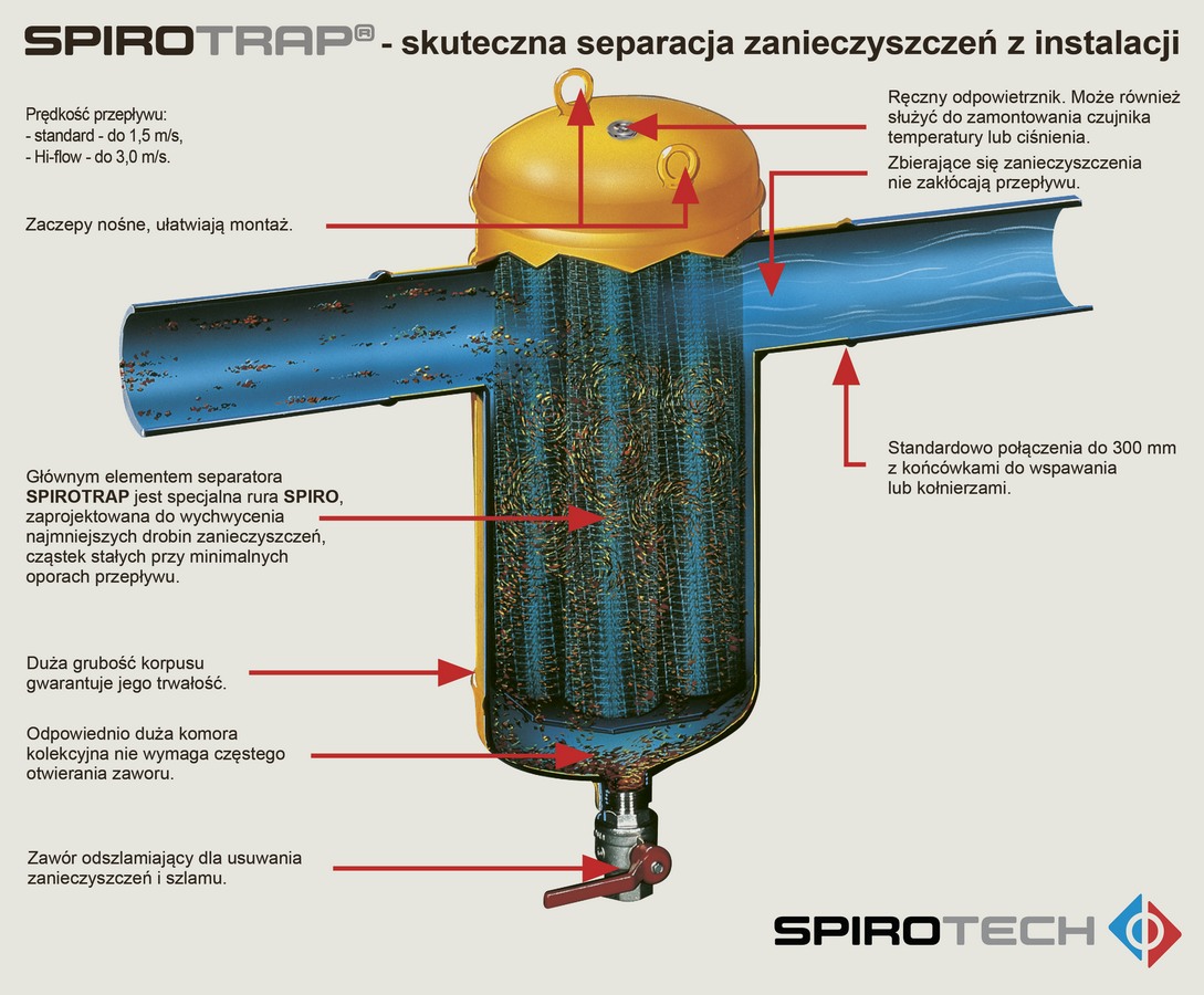 Separator powietrza i zanieczyszczeń SPIROCOMBI. Jest to urządzenie bezobsługowe, pracujące bez siatek i filtrów, zapewniające ciągłą separację powietrza (i gazów) oraz zanieczyszczeń stałych do najdrobniejszych cząstek, utrzymując instalację w stanie uzdatnienia. Wykonanie ze stali na rurociągi poziome DN50-DN300, połączenia kołnierzowe lub do wspawania.