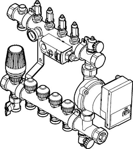 Stacja regulacyjna dla małych powierzchni. Przeznaczenie: ogrzewanie powierzchniowe Fonterra, stała regulacja temperatury na zasilaniu, łączenie ogrzewania podłogowego i grzejników na różnych poziomach temp., stal nierdzewna, zmontowana i odrutowana. Wyposażenie: Kompletny zestaw z belkami rozdzielacza z 4 przyłączami obwodów, pompa wysokowydajna Wilo Yonos PARA RS 15/6 RKA, zawór do termostatu, podtynkowa szafka rozdzielacza, ogranicznik dopuszczalnej temperatury, zawór regulacyjny na powrocie. Dane techniczne: maks. temperatura robocza 80 °C, ciśnienie robocze maks. 0,6 MPa, maks. wydajność grzewcza 3 kW, nr wzoru 1256, nr kat. 684 112, n: 4 B: 430 H: 480 T: 115 zakres regulacji: 20-70 °C,
